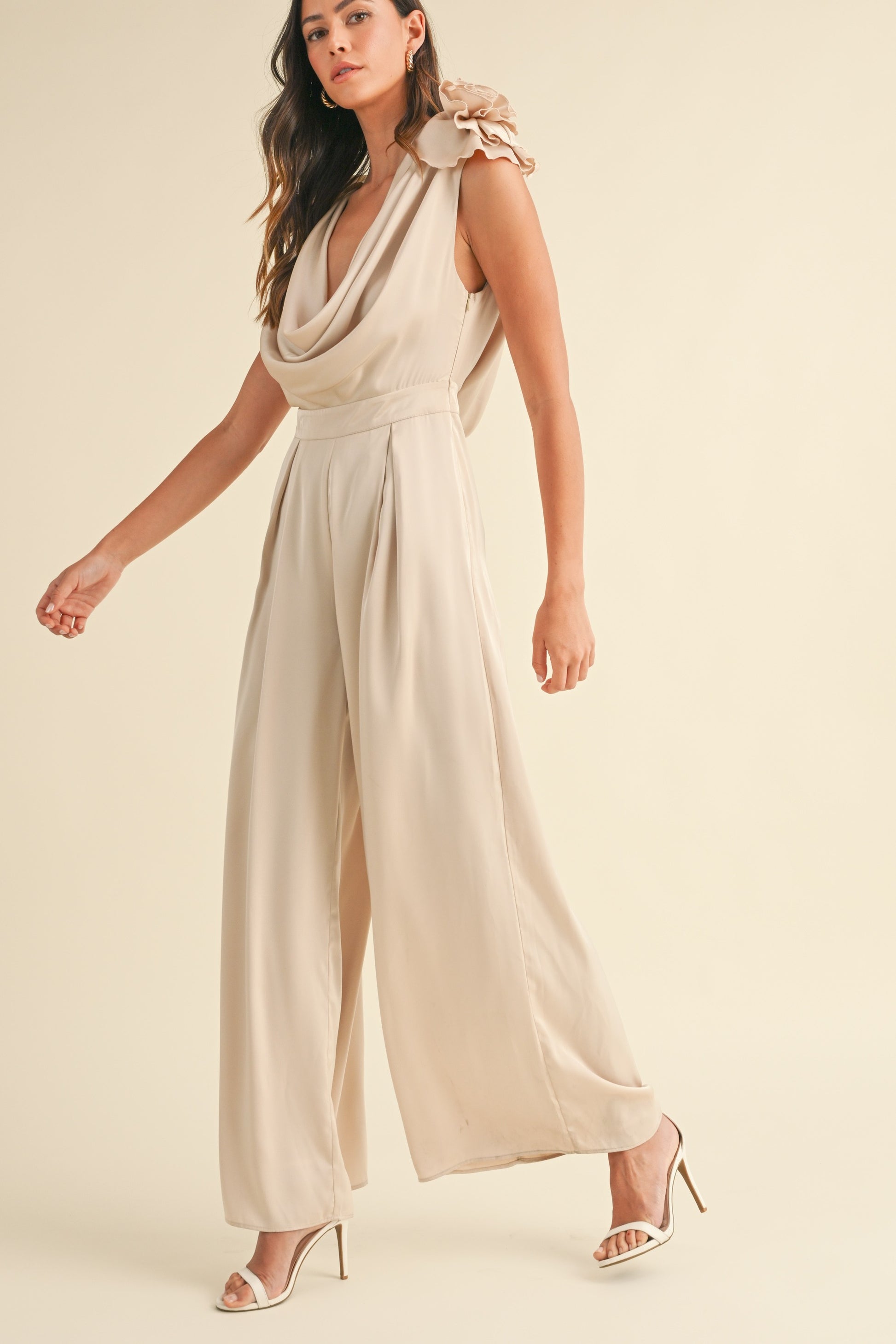 Introducing the Gabriella Cowl Pant Suit, a luxurious ensemble designed for the sophisticated woman. Made with satin fabric and adorned with 3D floral applique, this jumpsuit features a deep cowl neck for a touch of elegance. Elevate your wardrobe with this exclusive piece.